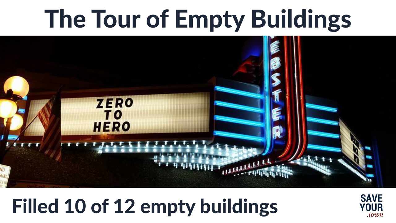Empty buildings need to be showcased, not ignored. Learn how Deb’s original Tour of Empty Buildings created new businesses and new energy for a small town. Together, they filled 10 of 12 empty buildings and saved their local movie theater.